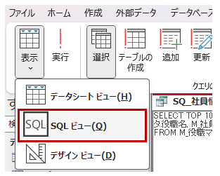 クエリの作成は「デザインビュー」か「SQLビュー」で行います。従来のビューの切り替えを、メニュー右端のボタンから行う必要がありました。