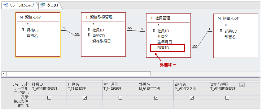 下記サンプル画像では、4つのテーブルをリレーションシップにより関連付けていますが、この中で「T_社員管理」と「M_組織マスタ」を結び付けている「T_社員管理テーブル側の部署ID」が外部キーです。