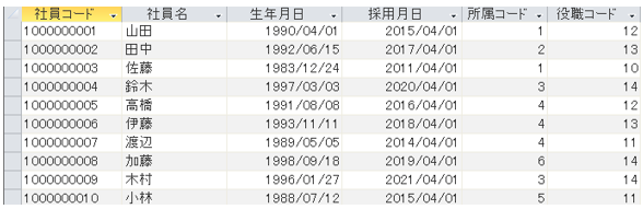 なお、本事例では抽出条件に使用した社員コードフィールドが文字列型であるため、条件の値をシングルコーテーション(’)で囲む必要があります。日付型であればシャープ(#)で囲む、数値型であれば不要です。
