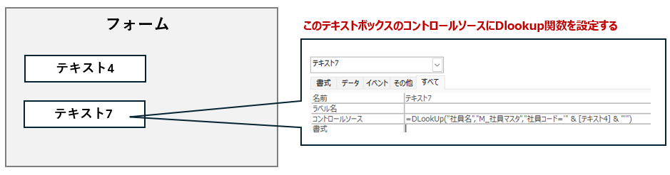 =DLookUp("社員名","M_社員マスタ","社員コード='" & [テキスト4] & "'")