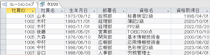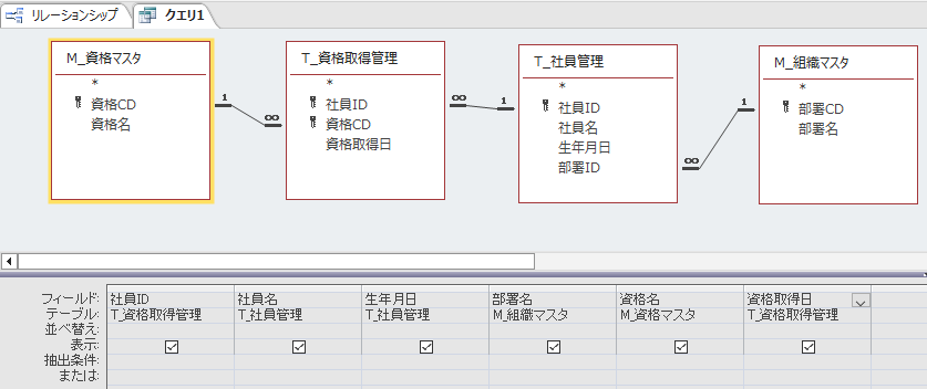 リレーションシップが設定されていると、クエリを作成する際に、自動的にテーブル間の結合を行ってくれます。