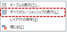 実は、リレーションシップオブジェクト画面に並んでいるテーブルをDELETEキーで削除すると画面上から消えますが、リレーションシップ自体は解除されません。右クリックの表示メニュー「すべてのリレーションシップの表示」をクリックすると、再度関連付けたテーブルが表示されます。