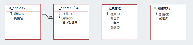 テーブル間の結合は基本的に主キー(鍵マークが付いたフィールド)同士を結びます。まずは「T_資格取得管理」と「M_組織マスタ」の『資格CD』同士を結んでみましょう。