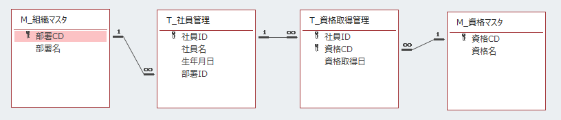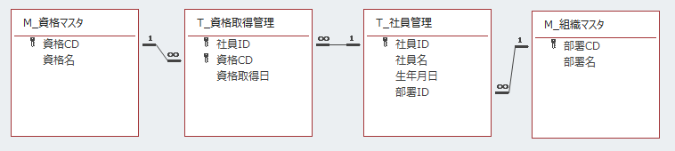 本記事のサンプルで用いているリレーションシップは、すべて一対多の関係です。これは「T_資格取得管理」が複合主キーであるため、他のマスターテーブルから見ると「多」のレコードとなるからです。