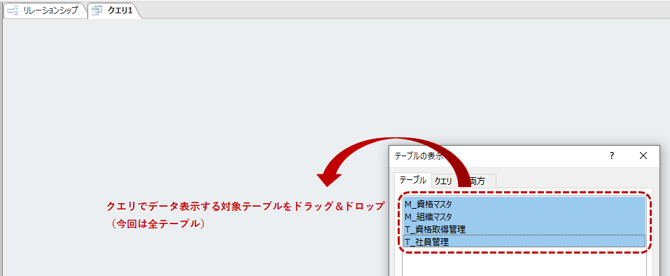 | リレーションシップ | リレーションシップオブジェクト画面で、テーブル同士の結合を行う ただし、データ表示はクエリで行う |