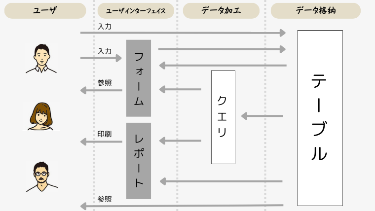以下の図は、Accessにおける各オブジェクトの関連性を示したものです。ご覧いただくと分かるように、レポートは、テーブルやクエリのデータを、印刷物として出力する役割を担っています。