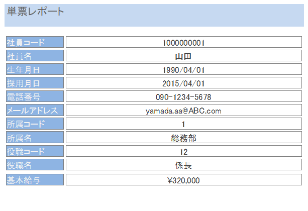このセクションの高さと配置が、レポートの基本的な表示形式(表形式、単票形式など)を決定します。 繰り返し表示されるセクションであり、レコードの数だけ表示されます。