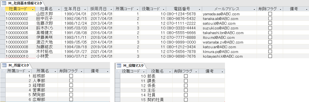 これで社員基本情報マスタテーブルが作成できました。同様の手順で「所属マスタ」「役職マスタ」も作成しましょう。