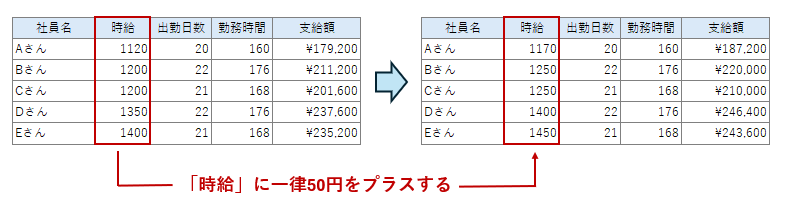 を書き込むことによって、Aさん、Bさんのレコードのみ、元々の時給に50円が加算されます。
