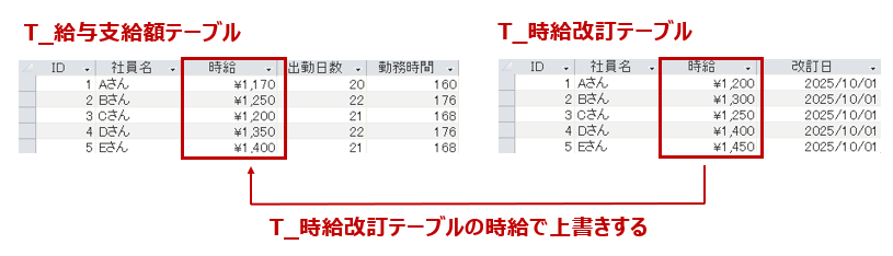 以下は、時給の改訂を管理するテーブルから「時給」の値を引っ張ってきて、上書き更新するイメージです。