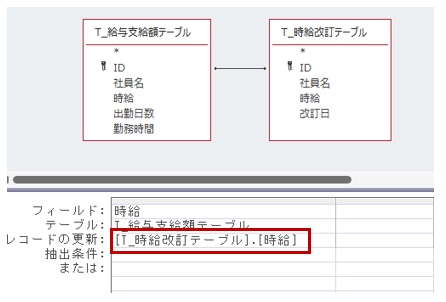 2つのテーブルの主キー同士で結合したうえで、「レコードの更新」欄に[T_時給改訂テーブル].[時給]