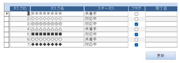 以下はタスク管理を行うためのフォームです。タスクが完了したフラグをONにし、更新ボタンをクリックすることで、ステータスフィールドが完了