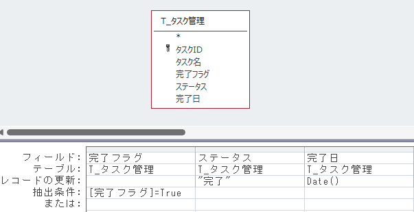 更新クエリ(UQ_タスク完了更新)の内容は以下のとおりです。