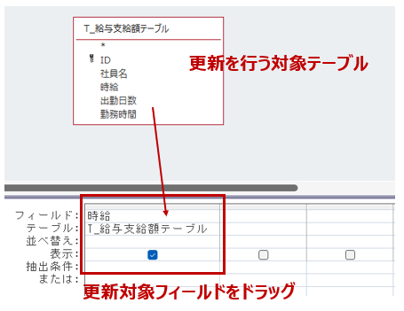 一方で、特定の条件に合致するレコードだけを更新したい場合は、更新条件を指定するためのフィールドも、あわせてデザインビューにドラッグします。