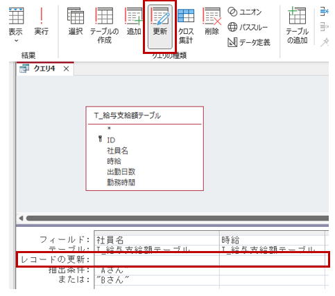 更新クエリに切り替えると、デザイングリッド上に「レコードの更新」欄が出現します。この部分に更新内容を指定します。