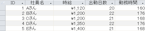 では、ここから具体的な更新クエリの作成手順を解説します。本解説では以下のテーブルをサンプルとして使用します。